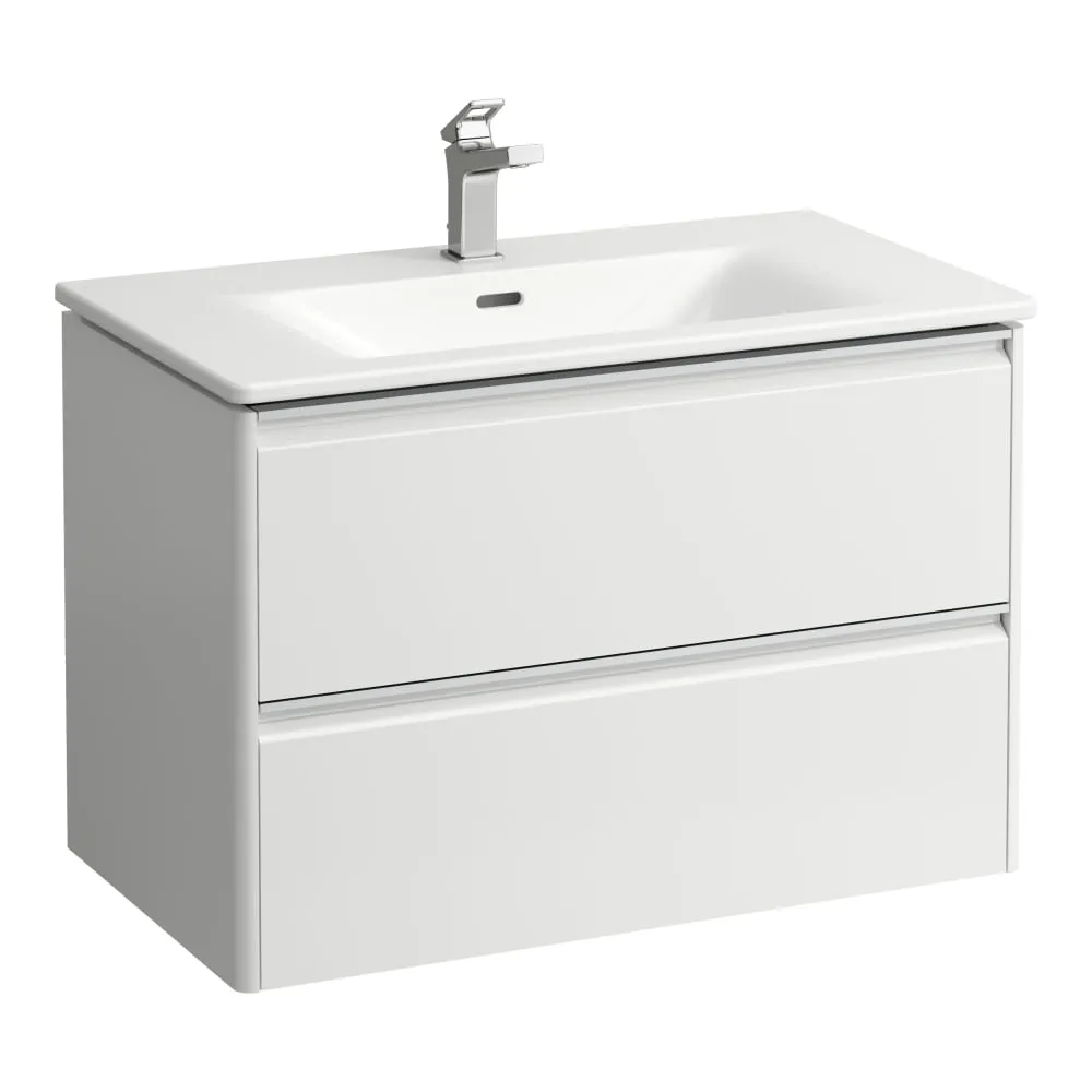 Waschtisch: Charge 104 – 1 Hahnloch mittig Waschtisch wird mit 2 Schrauben befestigt Waschtischunterbau Base: Weiß matt, Verkehrsgrau: Korpus/Front – MDF mit PVC-Folie beschichtet, Front mit ABS Kanten Weiß glänzend: Korpus/Front – MDF mit PETFolie beschichtet, Front mit ABS Kanten Ulme hell/dunkel: Korpus/Front – MDF mit CPLFolie beschichtet, Front mit ABS Kanten Front mit integrierten Griffleisten 2 Schubladen mit Vollauszug (Soft-Close) inkl. Schubladen-Ordnungssystem
