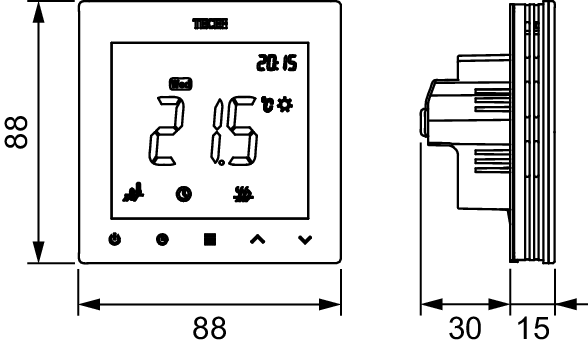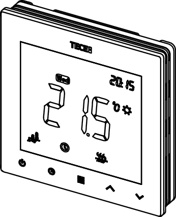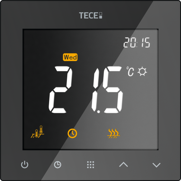Kabelgebundener Uhren-Raumthermostat für die Flächenheizung, vollflächige Glasoberfläche mit LC-VA-Display und kapazitiven Bedientasten, Betriebsart: Komfort, Eco, Frostschutz, OFF, 7-Tage Zeitprogrammierung, optionaler Anschluss eines externen TECE-Temperatursensor NTC 10 kΩ (77420074), Montage auf Unterputz-Einbaudose. Betriebsspannung: 230 V, 50/60 Hz, Schaltleistung: max. Last: 3 A