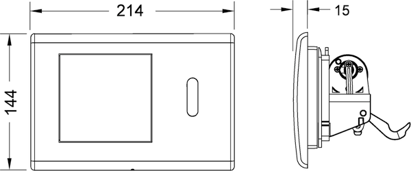 Zur berührungslosen Spülauslösung von TECE-Spülkästen. Passend für alle TECE-Spülkästen (Bautiefe 13 cm) mit Betätigung von vorne und Betätigungshöhe von ca. 1 m. Bestehend aus: Autofokus Infrarotsensor mit zwei Erkennungsbereichen zur Erkennung von stehenden oder sitzenden Personen Betätigungsplatte aus Edelstahl zur optionalen manuellen Spülauslösung wasserdichtes Batteriefach inklusive Lithium Batterie Typ 2CR5, 6 V DC elektrische Hebevorrichtung mit Servomotor komplett montiert auf Betätigungsbock voreinstellbare Vollspülmenge 4,5/6/7,5 oder 9 Liter Betätigungsstange und Befestigungsmaterial Programmierschlüssel Hygienefunktion einstellbar Kompatibel mit Einwurfschacht für Reinigungstabs.
