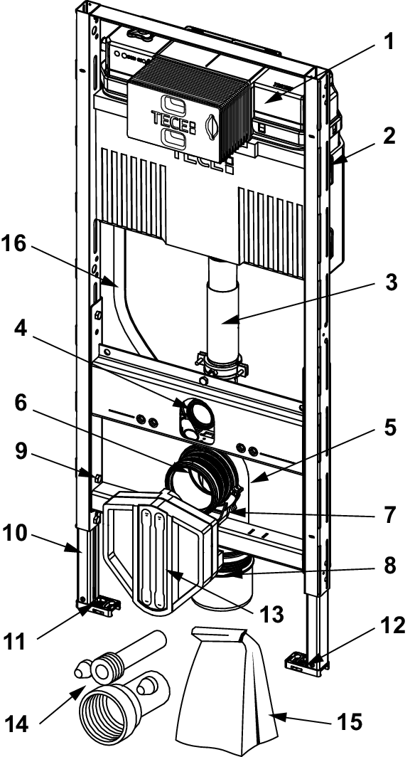 WC-Modul inklusive "easy fit" Betätigungsplattenmontage und Leerrohr für den Anschluss elektronischer Dusch-WCs. Zur Befestigung an TECEprofil Profilrohren oder für den Einbau in Metall- oder Holzständerwände und als Vorwand- oder Eckmodul; auch für die Einzelblockmontage geeignet. Uni-Spülkasten für Betätigung von vorne: Sicherheitstank aus schlagzähem Kunststoff, nach EN 14055 geprüft Spülkasten komplett vormontiert und versiegelt Spülkastenanschluss mit Außengewinde R 1/2" seitlich, kompatibel zu Schnelladaptern 10 Liter Tankvolumen; 6 Liter voreingestellte Standardspülmenge; 4,5/7,5/9 Liter Spülmenge jederzeit einstellbar; 3 Liter Teilmengenspülung bei Zweimengentechnik; Einstellung einer 4/2 Liter Spülmenge optional möglich; Restvolumen zur sofortigen Reinigungsspülung nutzbar. schwitzwasserisoliert für TECE-Betätigungsplatten und WC-Armatur als Ein- oder Zweimengenspülkasten einsetzbar "easy fit" Betätigungsplattenmontage Installationstunnel für Serviceöffnung, ohne Werkzeug kürzbar geräuscharmes hydraulisches Füllventil, Armaturengruppe 1 nach DIN 4109 Spülstromdrossel einstellbar ohne Demontage des Ablaufventils Modulrahmen: Unterer Bauraum zur Keramikanbindung unabhängig von der Modulhöhe in der Rohbaumontage 6 cm höhenverstellbar. selbsttragend, pulverbeschichtet zwei Haltebolzen und Muttern M 12 WC-Ablaufbogen DN 90 mit Übergangsadapter DN 90/100 aus PP Übergangsadapter auch für waagerechten Einbau geeignet WC-Anschlussgarnitur DN 90 WC-Anschlussbox inklusive Rohbauschutz und Leerrohr für universellen Dusch-WC-Anschluss (Position prüfen), mit Abzweigdose und Abdeckung für Trafo. Einstellung einer erhöhten Keramikbefestigung für 48 cm Sitzhöhe gemäß DIN 18040 möglich (DIN 18040: Barrierefreies Bauen - Teil 1: Öffentlich zugängige Gebäude und Arbeitsstätten). Bitte separat bestellen: WC-Betätigungsplatte (siehe Betätigungen) Befestigung für die Vorwand-, Eck- oder Holzständermontage Einwurfschacht für Reinigungstabs (optional) TECE-Aufrüstset Trockenbau für TECE-Dusch-WCs (optional) Hinweis: Bei Verwendung von WC-Keramiken mit reduzierter Auflagefläche (= Abstand von Mitte Befestigungsbolzen bis Unterkante Auflagefläche nicht größer als 18 cm) - z. B. V & B Memento, Subway 2.0 - ist der Einbau des Stahlstrebensets 9041029 im unteren Bauraum erforderlich.